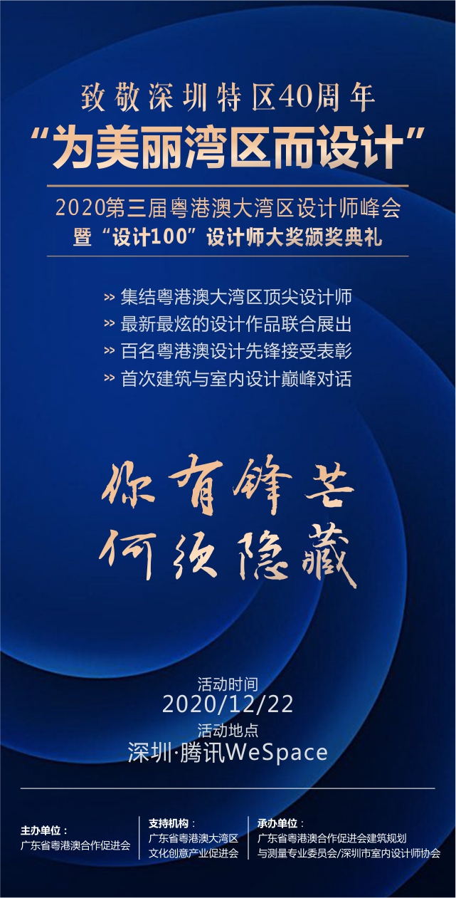 在深圳特区40周年之际,2020第三届粤港澳大湾区设计师峰会将邀请粤港澳大湾区设计界意见领袖、国内外具有影响力的设计师及设计行业人士汇聚深圳,通过设计大师的主题演讲、高峰论坛等形式,展现具有大湾区开拓进取、勇于创新精神的设计界老将与新兵风采。以设计驱动城市建设、设计驱动产业、设计驱动创新,实现区域产业联动发展。