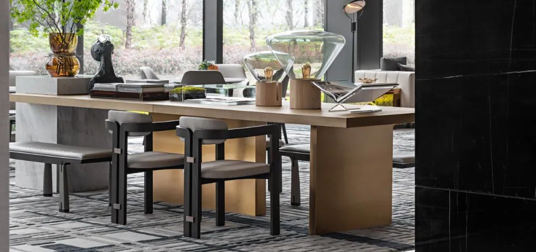 洽谈区临窗而设,在自然光影与几何灯饰的双重缀衬下,营造着都会自然生活的美学意境,契合空间整体流露的盈盈诗意与情调。家具陈设选用大理石、木质、皮革、软包等质感进行相搭,纹理间透着不凡的艺术张力,空间格调简繁有序、相映成趣。